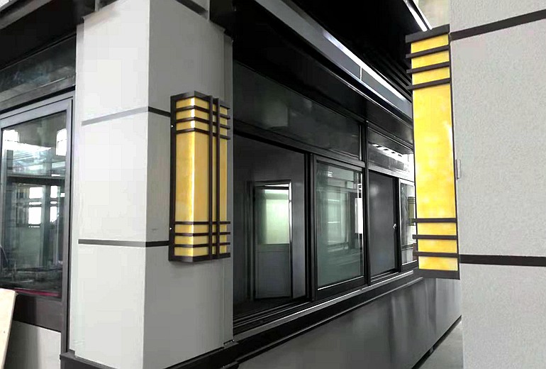 墻體部分:立柱采用10#槽鋼、100*1003m熱鍍鋅方管、支撐柱龍骨采用40*60*3mm熱鍍鋅管、外面板采用真石漆工藝、方通架襯板為硅酸鈣板、內墻則是使用簡潔耐用的pvc扣板