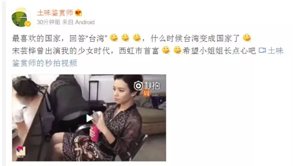 有網友在微博爆料,《西虹市首富》女主角夏竹扮演者宋蕓樺,在一個節目上被問到“最喜歡的國家”時,不假思索的答案是“最喜歡國家 臺灣”。