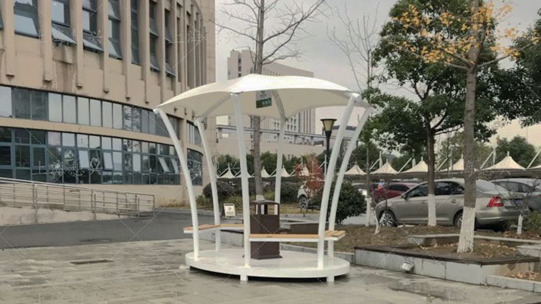 安徽蕪湖煙草局膜結構吸煙亭細節介紹:1、支撐柱:采用80*80mm熱鍍鋅管焊接而成;2、底部:花紋鋁板3、頂部:膜結構4、標準配置:煙灰桶、座椅5、加配裝置:點煙器;6、規格:根據客戶場地要求量身定做