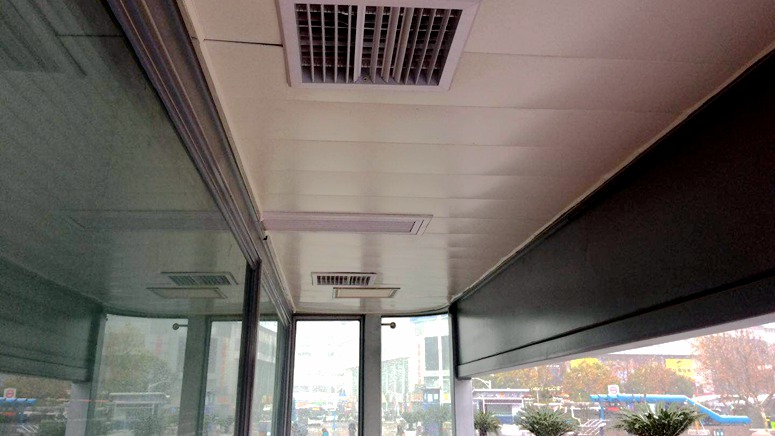頂部部分:頂部由60*80*2.5mm熱鍍鋅管作為龍骨,覆蓋硅酸鈣板及木杉板,中間部分可加保溫材料。 水桶底工藝的應(yīng)用,保證了頂部沒有雨水滲漏的現(xiàn)象發(fā)生。外部為鍍鋅板氟碳噴漆,內(nèi)頂則是使用現(xiàn)代家裝的優(yōu)選pvc吊頂,給警務(wù)崗?fù)さ膬?nèi)部提供了一個舒適的構(gòu)成。